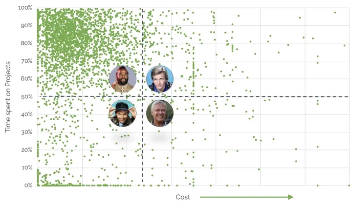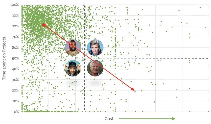 For this analysis, we reviewed several million anonymised timesheets from architecture and engineering practices. Each employee was plotted based on two factors:
