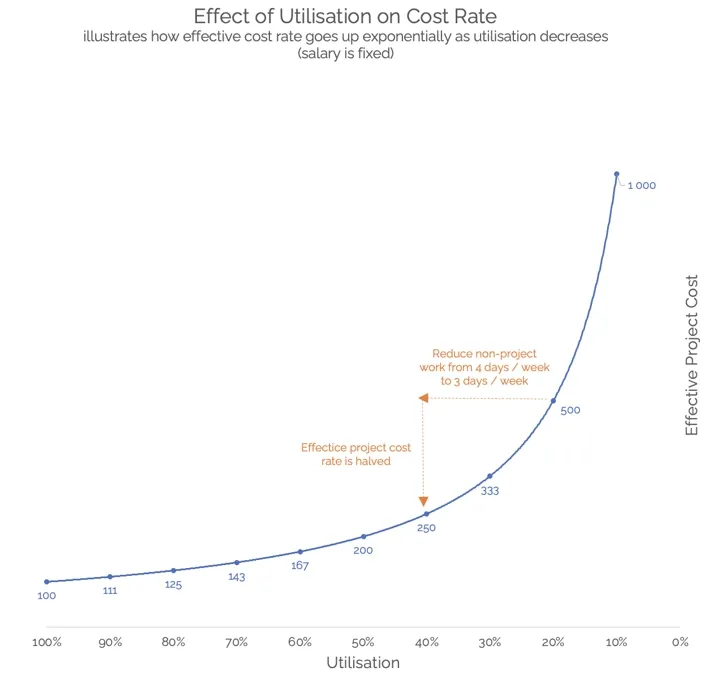 For example, if a highly paid project leader spends too much time on administrative tasks, their effective cost rate on projects increases sharply and margins disappear.