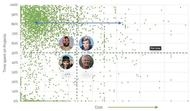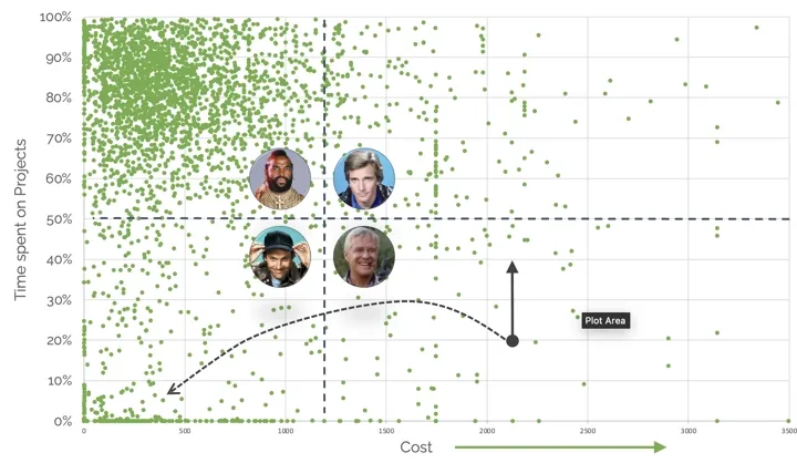 Each dot represents one employee. Higher cost moves the dot to the right. Higher utilisation moves it upwards.