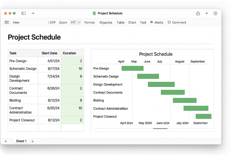 Apple Numbers is far less common than Excel or Sheets, but you still see it in small Mac-first studios or for lightweight internal work. Numbers is known for a clean interface and presentation-ready tables and charts, which can suit fee proposals or client-facing schedules.