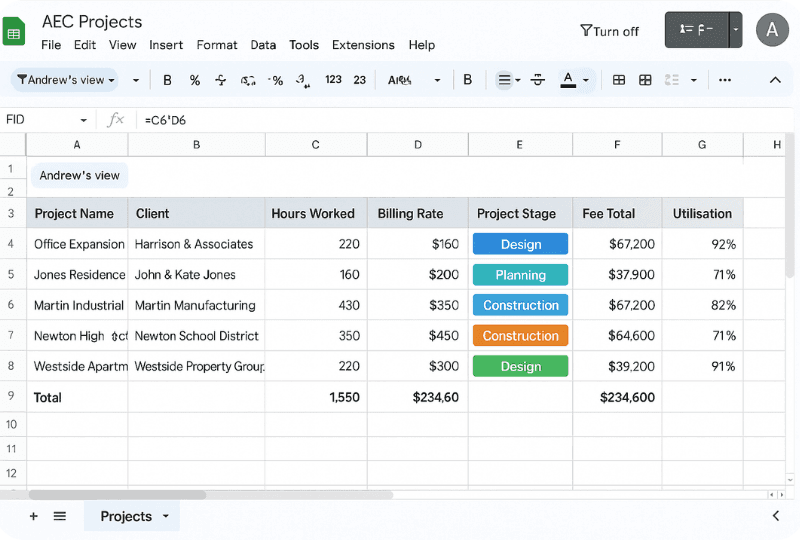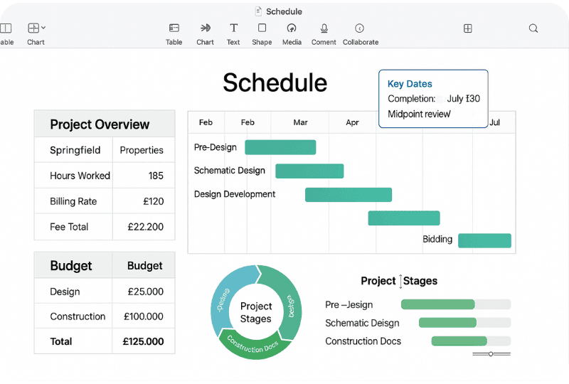 That said, Numbers lacks many advanced features and cross-platform compatibility. Collaboration via iCloud is limited compared to Google’s real-time editing, and most larger A&E firms standardise on Excel or cloud-based tools. Numbers remains a niche rather than a firm-wide standard.