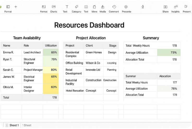 However, not all spreadsheet platforms are equal and the way spreadsheets behave in a larger firm is very different to a five-person studio. This article examines the prominent spreadsheet software used in A&E firms, chiefly Microsoft Excel, Google Sheets, and Apple Numbers (with a look at others like Smartsheet), and analyses the features A&E professionals find most useful. We also highlight some powerful but underutilised features that can boost productivity and reduce risk in real-world A&E workflows.